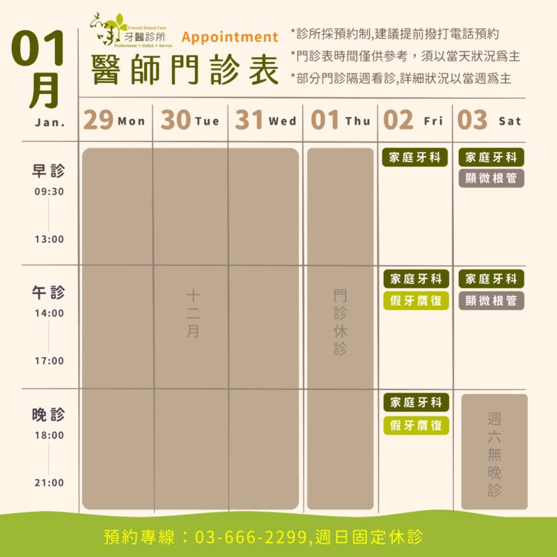 1月的各科門診時間